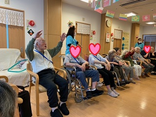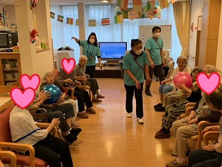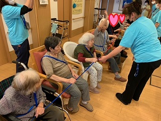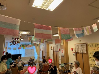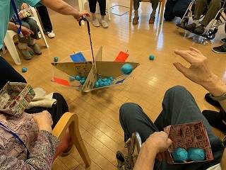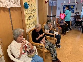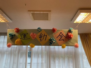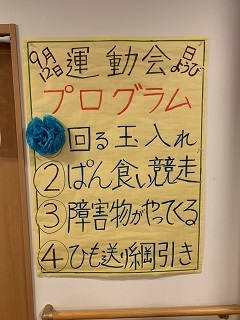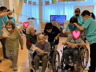 面会や外出に制限を受けている毎日です。 少しでも気晴らしをしていただこうと、ミニ運動会を開催しました。 ![]() ![]() 入居者の方々に、塗ってもらった万国旗です。 ![]() 4種目行いました。 ![]() まずは、回る玉入れです。 反対にした傘の中に、球を入れていきます。 みなさん頑張ってください(^O^)/ ![]() 2種目は、パン食い競争です。 みなさん、上手に取ってました。 ![]() 早速、おやつでパンをパクリ ^^) _旦~~ ![]() 3種目目は、障害物がやってくるです。 青組、赤組分かれて、物を先頭から送っていきます。 なかなか、白熱しました(^O^)/ ![]() 4種目目は、ひも送り綱引きです。 綱を引きあうのではなく、ひもを送っていき、先に端まで送った方が勝ちです。 ![]() 全種目が終わり、みんなで「ばんざい」(^O^)/ みなさんの笑顔が素敵な時間でした(^O^)