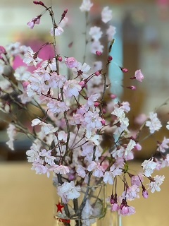 今年は開花が早く、施設駐車場の桜も綺麗に咲きました。 ちょっと拝借、食卓に彩を(^O^)/ ![]() |